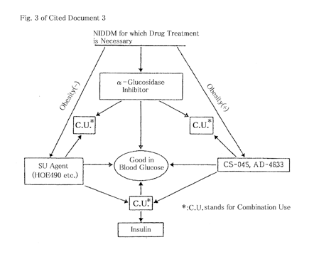 On the basis of the above findings and the disclosure of cited document 4, the IPHC decided that the technical concept of the administration of an insulin-susceptible enhancer and an α-glucosidase inhibitor in combination to diabetic patients had been publicly known at the time of the priority date of the present patent, and thus Fig. 3 of cited document 3 (see attached diagram) was deemed to disclose using pioglitazone (AD-4833) and α-glucosidase inhibitors, such as acarbose, voglibose and miglitol, in combination.